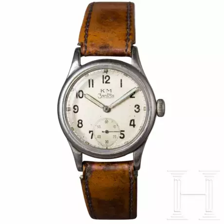 Armbanduhr mit silberfarbenem Gehäuse. Silbernes Zifferblatt mit schwarzen arabischen Indizes, nachtleuchtenden Markierungen und Zeigern, kleiner Sekunde auf der "6", Herstelleraufschrift "ZentRa" sowie "KM" für Kriegsmarine. Handaufzugswerk, punziert "ZentRa 338". Der rs. Schraubdeckel punziert, ohne Hoheitsadler und Marineabnahme. Durchmesser ohne Krone ca. 30 mm. Späteres Lederband, funktionsfähig.