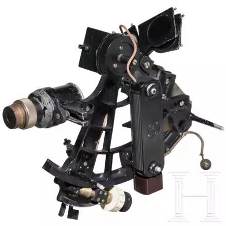 Schwarz lackierter Metallrahmen, Anforderungszeichen "Fl. 23870", Baumuster "GC 2", Hersteller "C. Plath, Hamburg", alle Justierungen und Einstellungen beweglich, ein Filter fehlt und der Rahmen hierzu ist auf der Unterseite gebrochen (fehlt). Alters- und Gebrauchsspuren. Der Sextant ist nicht ganz vollständig. Selten zu finden!