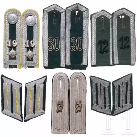Vier Paar Schulterstücke/-klappen, jeweils in der schwarzen Waffenfarbe. Schulterklappen und Kragenspiegel für einen Leutnant an einer Pionierschule. Zwei Paar Schulterklappen in der frühen spitzen Ausführung in Resada- bzw. Dunkelgrün für einen Uffz. im Pio.Btl. 12 bzw. 30. Dazu in zitronengelber Waffenfarbe: ein Paar Kragenspiegel für Offiziere der Nachrichtentruppe und ein Paar Schulterklappen für einen Feldwebel. Teils mottig.