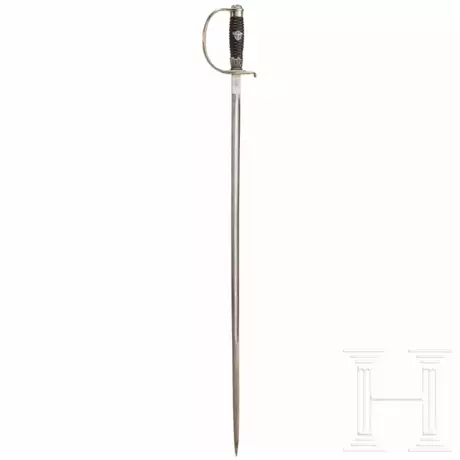 Gerade Rückenklinge (fleckig) mit geschlagenem Herstellerlogo und dem Runenlogo für Gahr, München. Vernickeltes eisernes Bügelgefäß, schwarz lackierter Holzgriff mit eingelegtem Polizeiadler. Ohne Scheide. Länge 94 cm.
