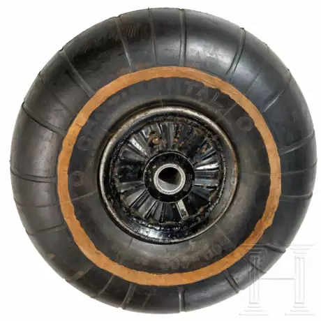 Schwarz lackierte Stahlfelge (flugrostig) mit Typenschild "Heckrad 560-200 - Geräte Nr. 8 - 3510 B 1 ... Hersteller CKZ" und wohl unbenutzten Reifen von Continental "560 x 200 Sporn".