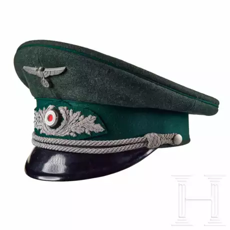 Cap body in dark green wool, green cap band, dark green piping, silver-aluminum chin cords attached by two silver finished pebbled buttons. Silver-finish metal eagle, silver-aluminum embroidered wreath and cockade with red cloth insert. Black lacquered visor with light brown, checkered finish underside. Gold imitation silk lining, moisture shield intact, manufacturer-marked with Clemens Wagner logo, light brown perforated leather sweatband. Size ca. 55.