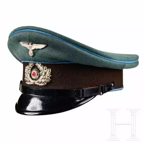 Cap body in field-grey wool, brown cap band, turquoise-blue piping, black leather chinstrap with black metal buckles attached by two black painted smooth buttons. Silver finish metal eagle and wreath, metal cockade with red cloth center. Black lacquered visor with light brown, checkered finish underside. Gold color imitation silk lining with water damage, moisture shield intact, remains of manufacturer marking, brown leather perforated sweatband exhibits age. Very minor damage to front of chinstrap. A few moth nips. Size ca. 57cm.