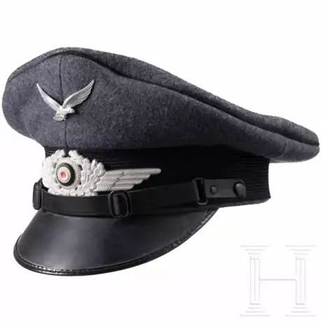 Luftwaffenblauer Gabardine mit schwarzen Mohairbesatzstreifen, schwarzen Vorstößen und schwarz lackiertem, unterseitig grünem Schirm. Braunes Kunstseidenfutter mit Silberdruck "Luxus" unter dem Mützentrapez und Ersatzmaterialschweißband (beschädigt). Metalleffekten (Hakenkreuz abgebrochen), schwarz lackierter Mützenriemen. Größe ca. 55. Seltene Waffenfarbe