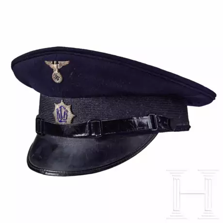 Cap body in dark blue wool, black mohair cap band, dark blue piping, black leather chinstrap with metal buckles attached by two black smooth finish buttons. Silver-finish metal NSDAP eagle, silver-finish metal RLB starburst emblem with blue enamel. Black visor with black, smooth finish underside. Blue artificial silk lining, moisture shield intact, impressed with RLB grading, light brown perforated leather sweatband with paper size tag “57” attached. Minor moth nips. Exhibits age.