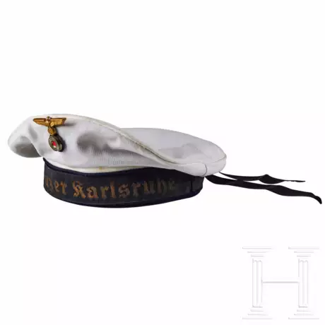 Cap body in white ribbed cloth, white piping, gilt metal eagle and metal cockade pinned to front, black silk tally, “Kreuzer Karlsruhe” machine-woven in golden-yellow secured at rear. Unlined, light brown leather sweatband. Exhibits age. Size ca. 54.