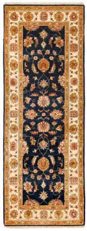 Afghanistan. Wolle auf Baumwolle. Im dunkelblauen, leicht abraschierten Innenfeld flächendeckende Musterung aus Palmettenranken. Umlaufend breite, korrespondierende Bordüre auf hellem Grund. 103 cm x 75 cm.