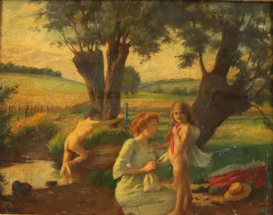 (1866 Savignac de Nontron 1950). Badende. Öl auf Holz. Ca. 27 x 35 cm. Unt. li. sign. Im goldfarb. Holzrahmen.