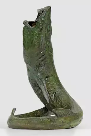 Bronze, dunkel und grün patiniert. Sign. u. bez. "Fonderie Rocher Paris" sowie Cire perdue 2/8". Der an der Akademie ausgebildete, bedeutende belgische Tierbildhauer Collin betrieb wie sein Mentor Rembrandt Bugatti, intensive Tierstudien im Zoo. Seine Werke wurden in den 1920er Jahren, in welche wohl auch die Entstehungszeit des in kleiner Auflage gefertigten Fisches fällt, mehrfach prämiert. Eine monumentale Großplastik eines Afrikanischen Elefanten wurde 1935 auf der Weltausstellung vor dem Pavillion des Kongo präsentiert. H. 35 cm.