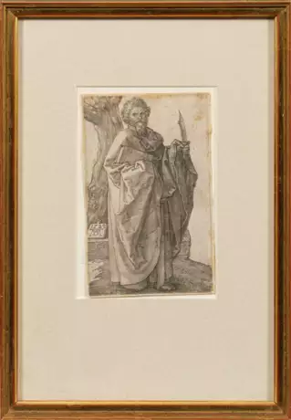 Der "Apostel Bartholomäus" entstand 1523 als Teil von Dürers unvollendeter Apostelserie, für die zwischen 1514 und 1526 fünf Blätter mit den Darstellungen von Paulus, Thomas, Bartholomäus, Simon und Philippus entstanden. Bartholomäus, dessen Gestalt in ein wallendes Gewand gehüllt ist und das annähernd gesamte Bildformat einnimmt, präsentiert dem Betrachter das Messer als Waffe seines Martyriums, während er in seiner Rechten ein Buch hält. In der kompakten Monumentalität der Darstellung klingt der Spätstil Dürers bereits an.