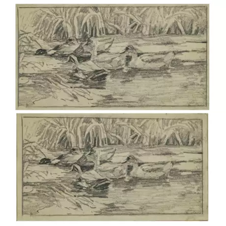 Each with the estate stamp on the backing verso. Pencil drawings on vellum. 14.4 x 19.8 cm / 9.6 x 17.4 cm. Mounted. Slightly stained. Framed (33 x 43 cm).
