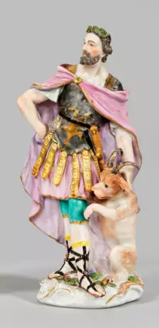 aus der Folge "Vier Monarchien". Auf rocaillereliefiertem Sockel, mit vorgestelltem linken Bein stehender, bärtiger Julius Caesar, die Linke liegt schützend auf dem Kopf des Tieres. Gekleidet in römischer Gewandung aus Harnisch mit Doppeladler und langem Mantel. Das Haupt ist von einem Lorbeerkranz bekrönt. Begleitet von einem aufrecht sitzenden, gehörnten Fabeltier. Polychrome Malerei mit Goldstaffage. Entw. Johann Joachim Kaendler, 1753. Partiell rest.; Unw. Brandrisse. Schwertermarke. H. 21 cm.
