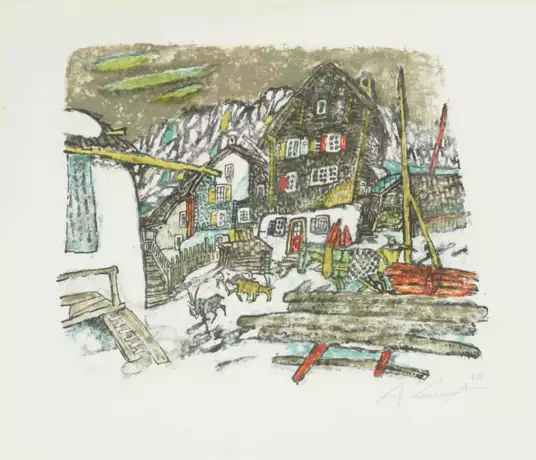 Häuser im Vals. 1974. Farblithographie. 94/250. Unten rechts in Bleistift signiert und datiert. Lichtmass 54,5x64 cm. Gerahmt.