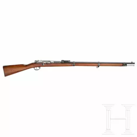 Cal. 11,15x60R M71, SN. 75923, nummerngleich inkl. Schrauben. Blanker Lauf. Fertigung 1888. Div. kaiserliche Abnahmen. Ohne Truppenstempel. Nahezu vollständig erhalten originale Brünierung von Lauf und Beschlägen, nur minimale Lager und Gebrauchspuren. Schloss mit Hülse blank. Nummerngleicher Nussholzschaft mit tiefen Stempeln, leichteren Lagerspuren. Bajonetthalter und Zusammensetzdorn etwas patiniert und gedunkelt, beide Riemenbügel. Mit originalem Mündungsschutz. Unberührte Erhaltung. Länge 129 cm.