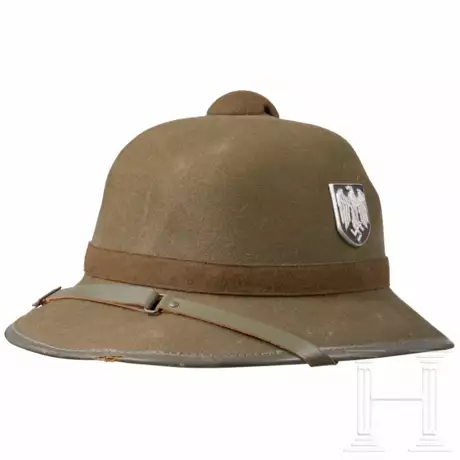 Olivbrauner Filzkorpus (kleine Dellen) mit feldgrauer Ledereinfassung und rotem Innenfutter. Helles Lederschweißband mit unterseitiger Größenangabe "56" und "F.ST.L" von 1942. Komplett mit Kinnriemen und beiden Schilden (teils migriert). Ungetragen.