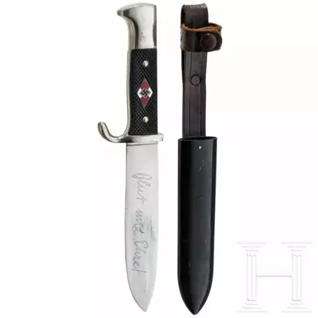Die Klinge mit Devise und Herstellermarkierung "J.A. Henckels Solingen - Zwillingswerk" und "Ges.Geschützt", schwarz gewaffelte Bakelit-Griffschalen mit eingesetzter HJ-Raute, vernickeltes Griffstück (magnetisch), originale schwarz lackierte Scheide, der Lack nahezu vollständig erhalten, braunes Trageleder mit Hersteller, bei einer Niete fehlt der "Kopf" hinten, minimale Alters- und Gebrauchsspuren.