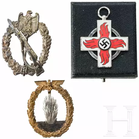 Lot 11169  | An Infantry Assault Badge in Silber, a Fire Brigade Honor Badge 2nd Class in case, and a Minesweeper War Badge