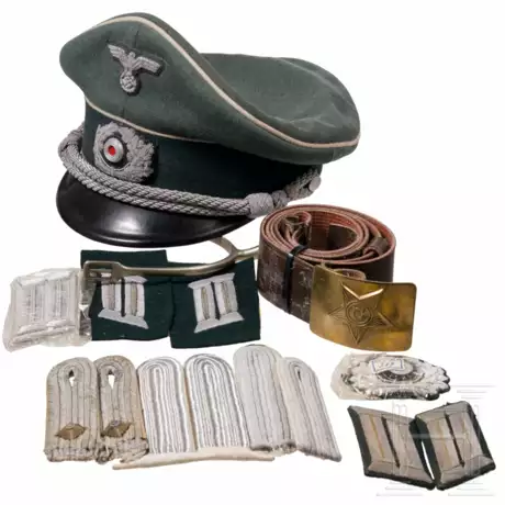Mütze aus feldgrauer Gabardine, weiße Paspelierung, handgestickte Effekten, braunes Innenfutter und Lederschweißband, Hersteller "Mützenfabrikation M. Drechsler München", mit Namensetikett und Feldpostnummer. Desweiteren drei Paar Kragenspiegel für Offziere, zwei Paar Schulterklappen Leutnant/Oberleutnant, zwei einzelne Schulterklappen Leutnant, ein Mützenkranz, teilweise noch original verpackt, eine Spore und ein russisches Koppelschloss mit Riemen. Alters- und Gebrauchsspuren. Feldpostnummer 32770 = Regimentsstab Infanterie-Regiment 468.