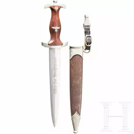 Aus Teilen zusammengestellt (assembled from parts) Blanke Klinge mit Devisenätzung und quartseitiger Herstellercodierung "RZM M7/85". Neusilber-Parierstangen, die untere punziert "Nm" (= SA-Gruppe Nordmark) und gestichelter Sturmnummer, brauner Holzgriff (Fehl- und Reparaturstellen). Bräunierte (fleckige) Stahlscheide mit Neusilberbeschlägen und Ledergehänge. Länge 34,5 cm.