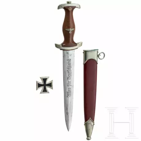 Die Klinge mit Devise und Hersteller "May & vom Hau Solingen-Ohligs", brauner Holzgriff mit eingesetzter SA-Pastille und Hoheitsadler, die Parierstangen aus Nickel, Gebietsgruppenstempel "Nm" für Nordmark, gravierte Sturmnummer "16/17675", die Scheide nachlackiert, Nickelbeschläge, der obere Beschlag ebenfalls mit der Sturmnummer, alle vier Schrauben vorhanden, sehr seltener Hersteller. Anbei ein Eisernes Kreuz 1. Klasse 1939 aus dem gleichen Nachlass, Hersteller "L15" (Otto Schickle), Eisenkern. Alters- und Gebrauchsspuren.