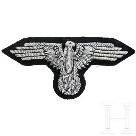 Metallfaden handgestickte Ausführung, rückseitige Papierabdeckung mit Resten des RZM-Papieretiketts, unsauber gesticktes Hakenkreuz, was bei dieser Variante vorkam.