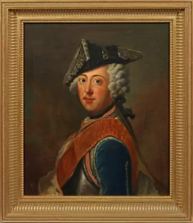 Brustbildnis des noch jungen Königs, der den Kopf mit Dreispitz nach links ins Dreiviertelprofil wendet, während der Körper ganz im Profil geschildert wird und der ruhige Blick sich dem Betrachter zuwendet. Über die linke Schulter gelegt, ist die orangefarbene Schärpe des Hohen Ordens vom Schwarzen Adler, über die andere Seite ein roter Hermelinmantel. Es zeigt den Monarchen noch als sensiblen Schöngeist, weit entfernt vom später harten Charakter des „alten Fritz“. Wohl nach 1760 entstandenes, repräsentatives, historisch bedeutendes Bildnis Friedrichs II., basierend auf dem vielfach rezipierten, letzten von Pesne nach der Natur gemalten Bildnis Friedrichs als Kronprinz bzw. junger König von 1739/1740 in der Berliner Gemäldegalerie (Staatl. Museen zu Berlin - Preußischer Kulturbesitz, Inv.-Nr. 489). Stil und weicher Malduktus, vor allem der Bereich der Kleidung erinnert stark an Porträts von Anna Dorothea Liszewska-Therbusch. Dazu zählen die Darstellung des Feldmarschall Graf Schmettau (Berlin, Staatliche Schlösser und Gärten, Verwaltung, Inv.-Nr. GK 2906) und ein Herrenbildnis in der Dresdner Gemäldegalerie (Alte Meister, Inv.-Nr. Gal.-Nr. 3156). Therbusch lernte bei ihrem Vater, dem Hofmaler Georg Lisiewski (1674 - 1750). Seit 1761 erlebte sie einen grandiosen künstlerischen Durchbruch in Stuttgart und Mannheim, 1765-1767 in Paris. Als eine der ersten Malerinnen erlangte sie höchstes gesellschaftliches Ansehen sowie berufliche Anerkennung und führte Aufträge europäischer Höfe und des Adels aus. 1769 kehrte sie nach Berlin zurück und wurde wohl 1771 preußische Hofmalerin. Öl/Lwd.; 67,5 cm x 58 cm. Rahmen.