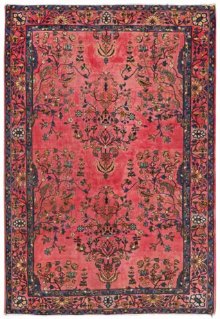 Persien. 1920er Jahre. Wolle auf Baumwolle. Im hellroten Innenfeld flächendeckende Musterung aus großen Blütenzweigen. Umlaufend korrespondierende Bordüre, begrenzt von blauen Bändern. 180 cm x 123 cm.