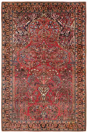 Persien. Um 1920. Wolle auf Baumwolle. Im roten Innenfeld passig geschweifte Nische, flankiert von Säulen. Mittig großes Vasenmotiv, Flächendeckend dichte Musterung aus Rankenwerk. Umlaufend dunkelgrundige Palmettenbordüre. 198 cm x 128 cm.