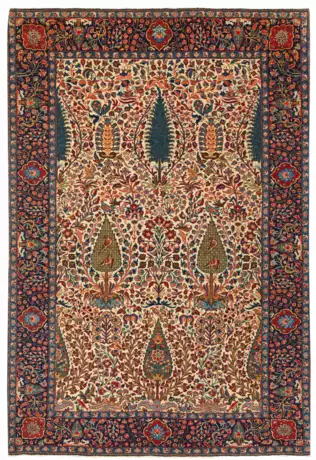 Zentralpersien. Um 1900-1920. Korkwolle auf Baumwolle. Im elfenbeinfarbenen Innenfeld flächendeckende Musterung aus dicht angeordneten Blütenranken und großen Zypressen-Motiven. Umlaufend breite, dunkelgrundige Bordüre mit Palmetten und Blütenzweigen. 204 cm x 141 cm.