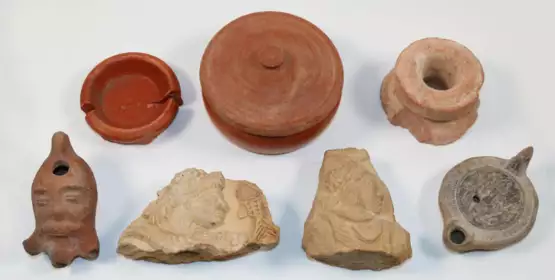 aus zwei Steinbildern mit männlichen Portraits, zwei römische Öllampen, Teracottascherben mit Reliefdekor, Deckeldose u. zwei wohl Deckel. Versand nur innerhalb Deutschlands.