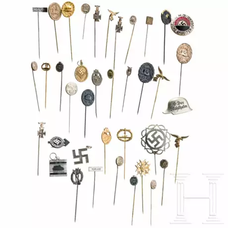Überwiegend 9- und 16-mm-Miniaturen, darunter ein Spanienkreuz, U-Bootskriegsabzeichen, PKA, ISA u.v.a. Außerdem Sympathie- und ausländische Abzeichen. Dazu ca. 12 BW bzw. Nachkriegsabzeichen. Teils beschädigt.