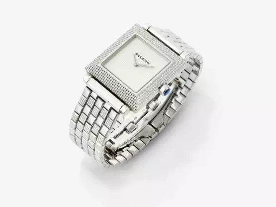 Quadratisches weißes Zifferblatt mit Stanzdekor, bezeichnet BOUCHERON, SWISS MADE. Rückseitig bezeichnet Boucheron, Seriennummer AJ409929, SWISS MADE. Original Gliederarmband mit Seriennummer AJ 411742.