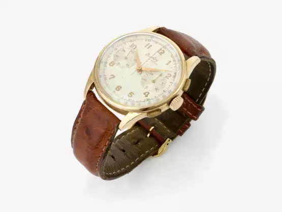 Cremefarbenes Zifferblatt mit aufgesetzten goldfarbenen arabischen Ziffern, kleine Sekunde bei der 9, kleiner Mintenzähler bei der 9. Rückseitig bezeichnet Breitling, 18K 750. Braunes Lederarmband.