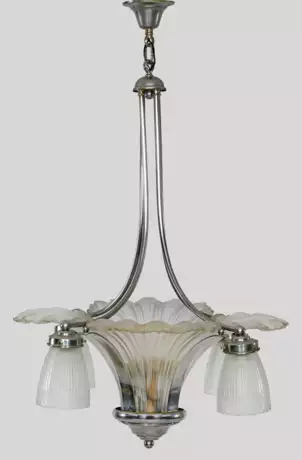 4-flg.; Metall verchromt sowie farbloses, satiniertes Glas. Kelchförmiger Korpus mit fächerförmigen Glaseinsätzen an hohen, geschweift ansteigenden Streben. Korrespondierende, kelchförmige Lampenschirme. Innen vier weitere Lampenfassungen. Elektrifiziert. H. 83 cm. D. 53 cm.