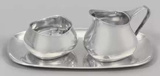 Sterlingsilber. 3-tlg.; Sahnegießer, Zuckerschale und Tablett. Rechteckige Grundform mit gerundeten Ecken; Zuckerschale und Sahnegießer mit flachem, bauchigen Korpus und glatter Wandung. Gest. 925, Herstellerzeichen. Gew. zus. ca. 310 g. H. 4,5 cm - 7 cm. Tablett: 20 cm x 11 cm.