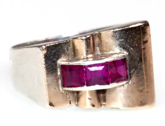 Lot 811 | Art-Deco-Ring, Silber (geprüft) z.T. vergoldet, undeutl. punziert, mit roten Farbsteinen besetzt, Ges.-Gew. 8,2 g, RG 60