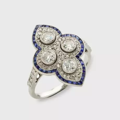 Weißgold, gest. 750 (Franz. Feingehaltspunze). Ausgefasst mit Altschliffdiamanten sowie Diamantrosen von zus. ca. 0,40 ct., entouriert von kleinen Saphir-Carrées. Gew. ca. 5,22 g.