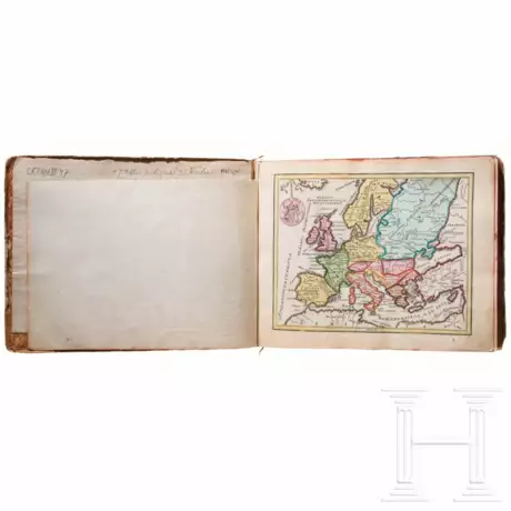 Am Rücken goldgeprägter, altersbedingt beriebener Ledereinband mit kaum leserlicher Inschrift und rot gefasstem Buchblock. Hierbei handelt es sich um einen wohl gegen Ende des 18. Jhdts. aus zwei verschiedenen Werken zusammengestellten Atlas, wobei nur die Tafeln, kein Text, übernommen wurden. Der erste Teil kann Johann David Köhler zugeschrieben werden und umfasst ca. 35 kolorierte Karten. Der zweite Teil besteht aus ursprünglich in der 1. Hälfte des 18. Jhdts. in Johann Christoph Weigels Atlas Portatilis publizierten Karten. Die etwas schmaleren Maße der zweiten Quelle wurden zur Vereinheitlichung durch das Aufkleben der Seiten angepasst. Auf dem Vorsatz vorne und hinten handschriftliche Anmerkungen in Bleistift. Die Seiten im ersten Teil sehr gut erhalten, vereinzelt etwas berieben. Im zweiten Teil etwas vergilbt, stellenweise mäßige Feuchtigkeitsschäden. Maße 19 x 25 cm.