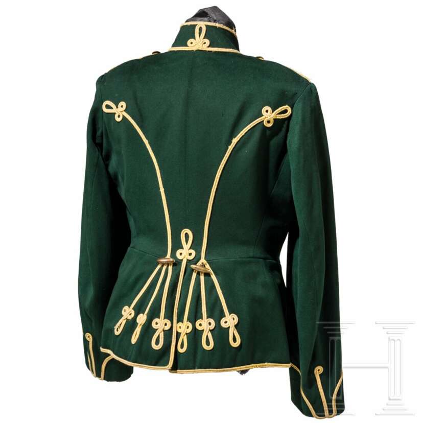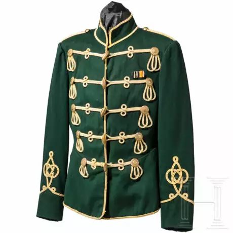 Eigentumsstück aus feinem dunkelgrünen Tuch mit zitronengelben Verschnürungen (ausgeblichen), glatten Buntmetallknebeln und reliefierten Rosetten, Stehkragen, auf der Schulter zwei Eskadronknöpfe "5". Gepolstertes schwarzes Seidenfutter mit zwei Schoßinnentaschen und Brusttasche. Hakenverschluss unvollständig. Teilweise kleine Mottenlöcher, Risse, Reparaturen, Trage- und Altersspuren.