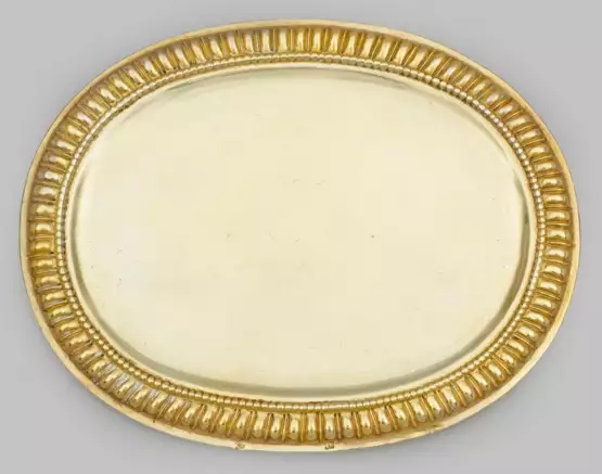 Silber, voll vergoldet. Über vier abgeflachten Kugelfüßen ovaler, glatter Spiegel und leicht aufgewölbte mit Perlband abgesetzte und mit Zungenfries reliefierte Fahne mit glattem, ausgestellten Rand. Gest., Tremolierstrich, Beschauzeichen, Meister Johann Betz (wird Meister um 1659). Gew. ca. 165 g. 16,5 cm x 13 cm.