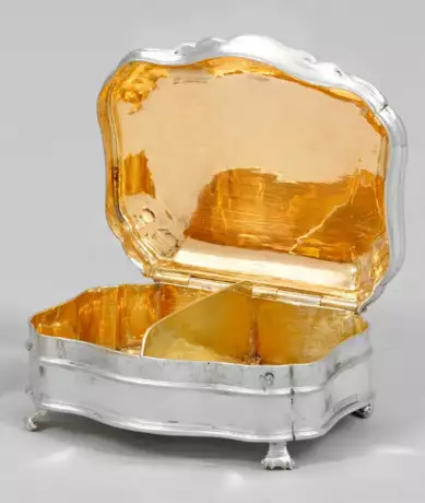 Silber. Auf vier stilisierten Volutenfüßen annähernd rechteckiger, passig geschweifter Korpus mit leicht aufgewölbtem, rücks. scharnierten Deckel. Innen vergoldet, mit mittiger Trennwand. Gest. Beschauzeichen, Meister Peter Christian Roser (wird Meister 1739). Gew. ca. 70 g. H. 2,5 cm. 6,5 cm x 5,5 cm.