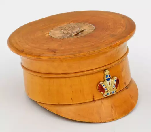 in Form einer russischen Offiziersschirmmütze. Karelische Birke. Schauseitig applizierte und fein polychrom emaillierte Zarenkrone. Zentral im Deckel eingelassene, runde Plakette aus Rotgold mit Profildarstellung des Zaren Nikolaus II. und seiner Gemahlin Alexandra Fjodorowna, umzogen von strahlenförmigem Reliefdekor. Auf der Deckelinnenseite ligiertes, bekröntes kyrillisches Monogramm, gerahmt von wehenden Bändern. Dosenunterseite mit geritzter Jahreszahl "1904" sowie Reste eines alten Etiketts. H. 3,7 cm. D. 6,3 cm.