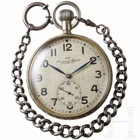 Taschenuhr mit silberfarbenem Gehäuse. Nachtleuchtendes Ziffernblatt mit schwarzen arabischen Indizes und gebläuten Zeigern, kleiner Sekunde auf der "6", Herstelleraufschrift "International Watch Co Schaffhausen" sowie "KM" für Kriegsmarine. Brücken-Ankerwerk im Handaufzugskaliber 67 mit Schwanenhalsfeinregulierung, Gegendruckfeder, 15 Steinen und Breguet-Spirale. Der rs. Deckel mit außenseitiger Marineabnahme "M 7231" unter Hoheitsadler sowie "II. Kl." für das Prüfergebnis der 2. Klasse, innenseitiges IWC-Logo und "1081361", nummerngleicher Staubdeckel. Durchmesser ohne Krone ca. 58 mm. Zivile Kette, funktionsfähig, jedoch Service bzw. Nachregulierung empfohlen, keine Gewähr für Ganggenauigkeit und Dauerfunktion.