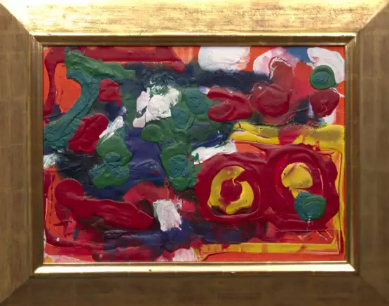Lot 44 | Baerwind, Rudolf (1910 Mannheim-1982 ebenda) "Abstrakte Komposition", Öl/ Platte, rückseitig Widmung, dazu Buch, 35,5x50 cm, Rahmen
