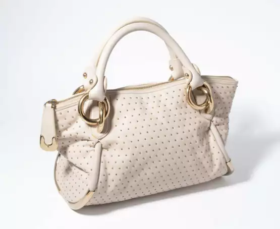 Aus hellbeigem Leder mit Nieten-Dekor. Goldfarbene Metallbeschläge. Zwei abgerundete Tragegriffe. Reissverschluss. 30x20x12 cm.