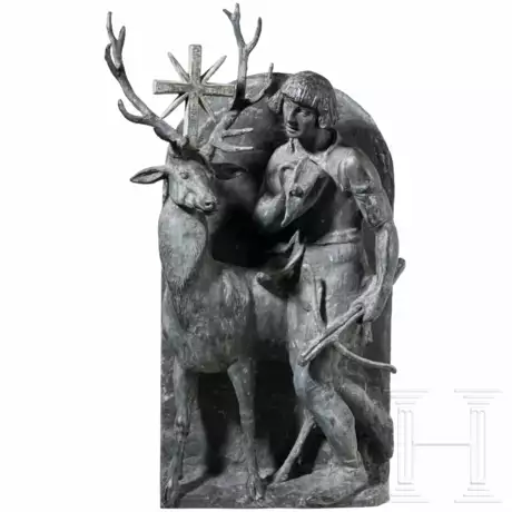 Aus Bronze gegossene, massive Skulptur des Heiligen Hubertus. Seine Armbrust und einen Jägerhut in den Händen haltend, wendet sich der junge Schutzpatron der Jäger mit Vorsicht und Demut dem majestätischen Hirsch zu, in dessen Geweih ein Kruzifix erscheint. Stellenweise Reste der ehemals vollflächigen Behandlung mit Silberbronze-Farbe (bzw. einer vergleichbaren farbigen Fassung mit silbrigem Schimmer). Rechts an der Rundbogenplatte signiert "Balth. Schmitt". Die rechte untere Ecke der Plinthe gestempelt "Guss C. Leyrer München". Maße ca. 55 x 34 cm.