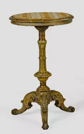 Holz, geschnitzt, gefasst und vergoldet. Mehrfach gegliederter Balusterschaft auf geschwungenen Volutenbeinen als Träger für runde, umlaufend profilierte Deckplatte mit Stoffbespannung. Erg.; H. 79 cm. D. 48 cm.
