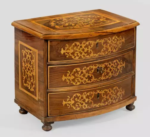 Nussbaum, furniert sowie Einlagen aus Ahorn. Gerader, rechteckig angelegter Korpus auf gedrückten Füßen. In der gegliederten Front drei bombierte Schubladen. Gering überstehende Deckplatte. Flächendeckende Furnierfelder mit üppigem Dekor aus Voluten. H. 39 cm. 46 cm x 33,5 cm.