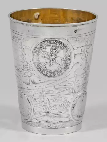 Silber. Konischer Korpus. Glatte, durch schmale Profillinien abgesetzte Randzone. Wandung zweireihig versetzt besetzt mit sechs Münzen gerahmt von fein gravierter Landschaft. Im Boden eine weitere eingelassene Münze. Innen vergoldet. Gebrauchsspuren. Gest. ungedeutete Punzen. Gew. ca. 230 g. H. 12 cm.