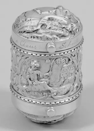 Silber. Zylindrisch, als Seitenabschlüsse gewölbte, scharnierte Deckel. Die Wandung reliefiert mit der Darstellung einer Schäferin vor fernen Gebäuden, umgeben von Blattranken. Auf den Deckeln zwei sitzende Personen mit Kreuz bzw. flammendem Herzen in der Hand. Innenfach geteilt durch Zwischenboden. Inschrift mit Dat. "Claus Schütte, 1756". Gew. ca. 105 g. H. 9 cm
